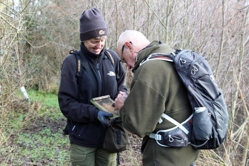 2020 has begun with mainly warm but wet and windy weather. For this reason, and because availability and willingness have not yet coincided with a suitable ringing day our first outing of the year was a well-attended joint Working Party with the dormouse enthusiasts to check nest boxes. Our bird nest boxes are now a significant part of the ringing year so it is fitting that we should start with them. In addition we have around 100 dormouse boxes and although they are labelled as such and have a hole facing a tree trunk rather than to the front the dormice and other rodents at Haseley do not discriminate between these boxes and the ones intended for birds so it makes sense for a maintenance party to examine both types of box at the same time. Since the Haseley Reserve is a refuge for all wildlife it seems right to document the use of the boxes. Licencing is via the British Trust for Ornithology (BTO) for birders and the Peoples Trust for Endangered Species (PTES) for dormousers.