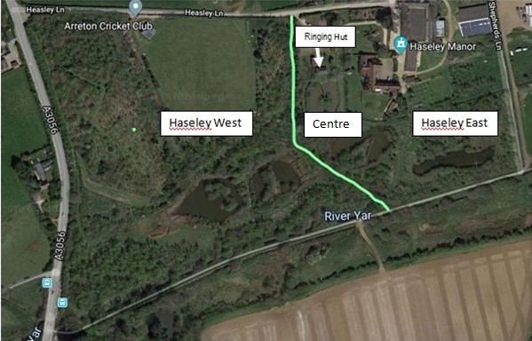 For ease of visualisation we split Haseley Reserve into roughly two halves separated by the public footpath (the green line on the map) and designated West and East.( Heasley Lane runs east-west and the Manor is built squarely to the main compass points.) Both halves have Upper and Lower sections, the Lower ones in each case being on the Eastern Yar floodplain (which was water meadow until 2001). West includes two large shallow lakes and East also has a lake. There is a fourth lake east of the footpath, designated Centre. The total lake area is around four acres but not more than around a metre deep. There is also a smaller deeper pool behind the Ringing Hut, a Medieval carp pond. The Upper sections are on higher land so not subject to flooding.